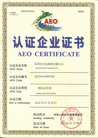 2015年7月29日,百业集团全资子公司东莞市百业商贸有限公司获得中华人民共和国黄埔海关颁发的“一般认证”证书。