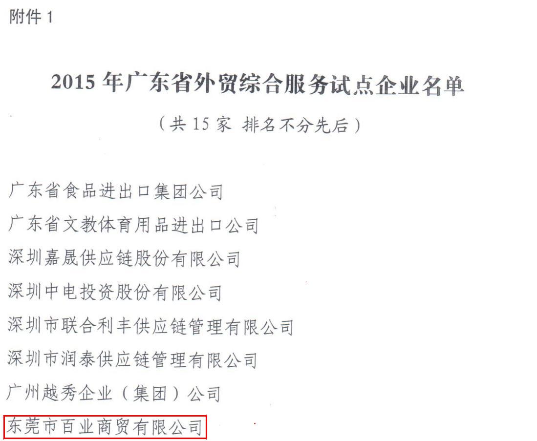 喜讯:百业商贸有限公司被评为“2015年广东省外贸综合服务试点企业”