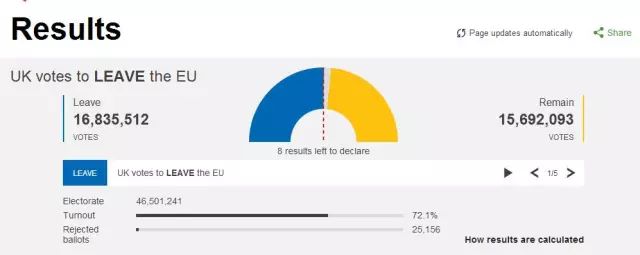 当地时间24日6时,英国公投脱欧阵营赢得超过1680万张选票,奠定最后胜利,英国公投选择脱离欧盟。截至6时,全部328个选区仅剩下8个选区进行最后的计票,但脱欧阵营已经赢得超过半数的1680万选票,超留欧阵营120万选票,已经赢得公投胜利,英国公投最后结果为脱离欧盟。