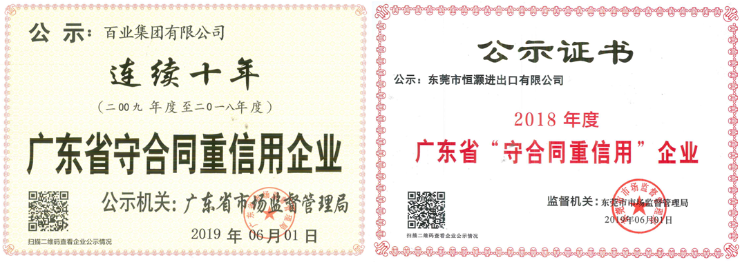 自古以来,诚信是商人经营立身之本。不论在任何时候、任何市场环境下,企业有良好的信用,会在许多方面受益,从而达成长远的发展。日前,经过广东省市场监督管理局严格的审核、评议,百业集团再次获得“广东省守合同重信用企业”称号。