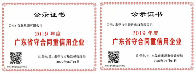 近日,广东省市场监督管理局对2019年度广东省“守合同重信用”企业名单进行公示,竞技宝官网及东莞市恒灏进出口有限公司皆荣耀上榜。